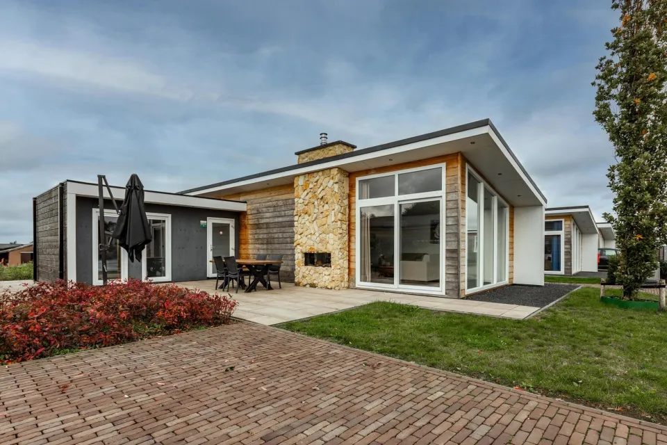Deze moderne L-vormige vakantiewoning (65m²) is van alle gemakken voorzien voor een comfortabel en ontspannen verblijf. De woning beschikt over twee slaapkamers met elk twee eenpersoonsbedden en een badkamer met dubbele wastafel, inloopdouche en een privé sauna voor een ultieme wellnesservaring.