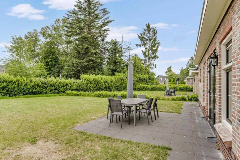 Buiten kunt u genieten van een ruime tuin met terras, waar u kunt ontspannen en genieten van de groene omgeving. De tuindeuren naar het terras brengen u helemaal "thuis in de natuur".