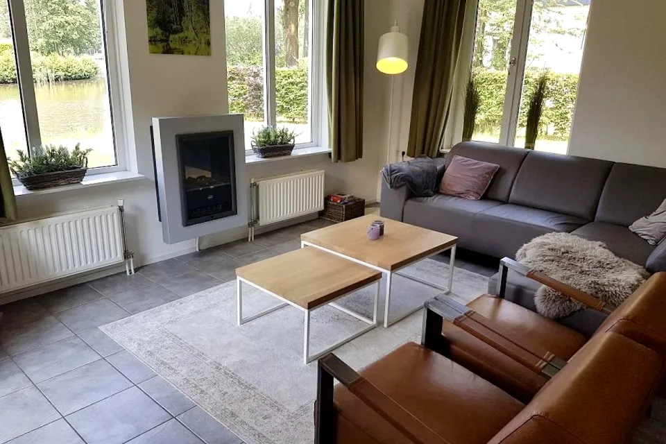 Stap binnen in de sfeervolle woonkamer. Hier ontspant u op een heerlijke loungebank, perfect om samen te zijn. Geniet van de warmte van de sfeerhaard op koudere avonden of kijk uw favoriete programma op de 43-inch Smart tv. Vanuit de woonkamer loopt u direct naar buiten, via een tuindeur, naar uw eigen terras.
