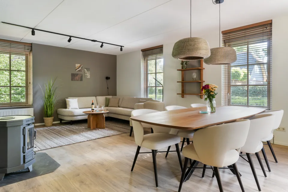 Dagpauwoog Gruun 22 is recent volledig gerenoveerd en straalt een frisse, eigentijdse sfeer uit. De combinatie van een stijlvolle inrichting, warme kleuren en moderne afwerking zorgt direct voor een gevoel van thuiskomen. In de woonkamer vind je een comfortabele zithoek met zachte banken, een open haard en een televisie – perfect om te ontspannen na een actieve dag. De grote ramen en openslaande deuren zorgen voor veel lichtinval en brengen buiten als het ware naar binnen.