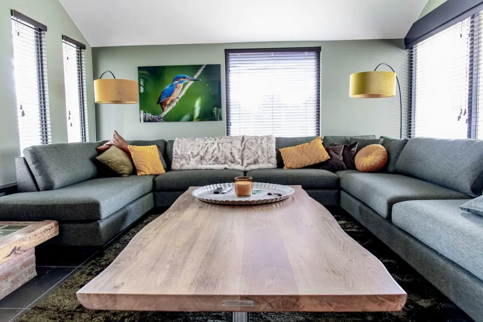 Op de begane grond stap je binnen in een lichte woonkamer met grote ramen en uitzicht op het water. De ruime zithoek met comfortabele banken nodigt uit om samen te ontspannen. Aan de eettafel is genoeg plek voor het hele gezelschap.