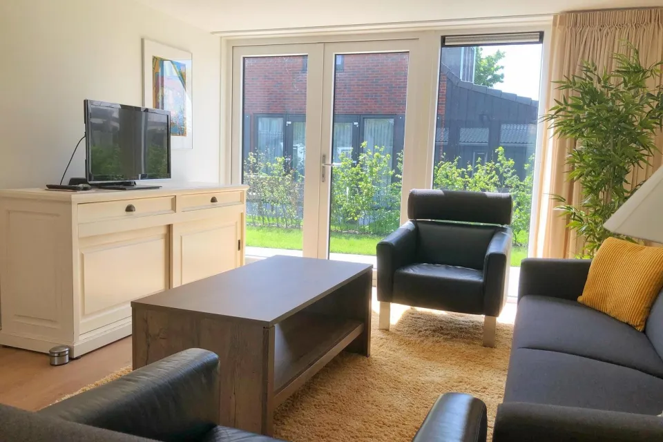 Buiten wacht een terras met tuinmeubilair. Je hebt uitzicht op het water en veel ruimte om te ontspannen. De grote ramen verbinden binnen en buiten, waardoor je overal dat echte vakantiegevoel ervaart.