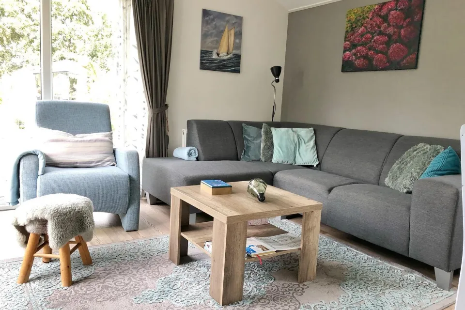 De woonkamer is gezellig en praktisch ingericht. Er staat een comfortabele bank, een smart-tv met Netflix en dvd-speler. Dankzij de grote ramen is de ruimte licht en uitnodigend.