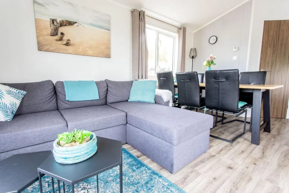 De woonkamer is licht en sfeervol ingericht. Comfortabele banken, een flatscreen-tv en een ruime eettafel maken dit de plek waar je samenkomt. Grote ramen laten veel daglicht binnen en geven direct zicht op het groen buiten. In de open keuken vind je alles voor een zorgeloze vakantie: een combimagnetron, kookplaat, waterkoker. Handig, snel en praktisch.