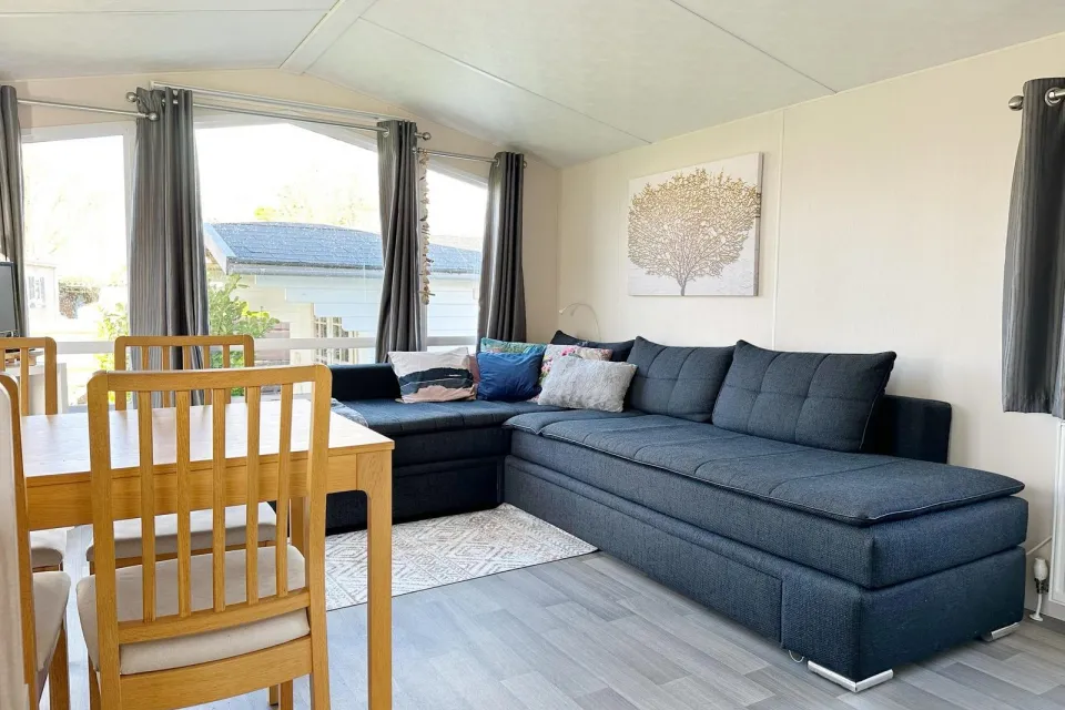 Je stapt binnen in een lichte woonkamer. Er staat een comfortabele slaapbank en een eettafel voor vijf personen. Lekker samen zitten. De smart-tv en gratis wifi zorgen dat je niets mist.