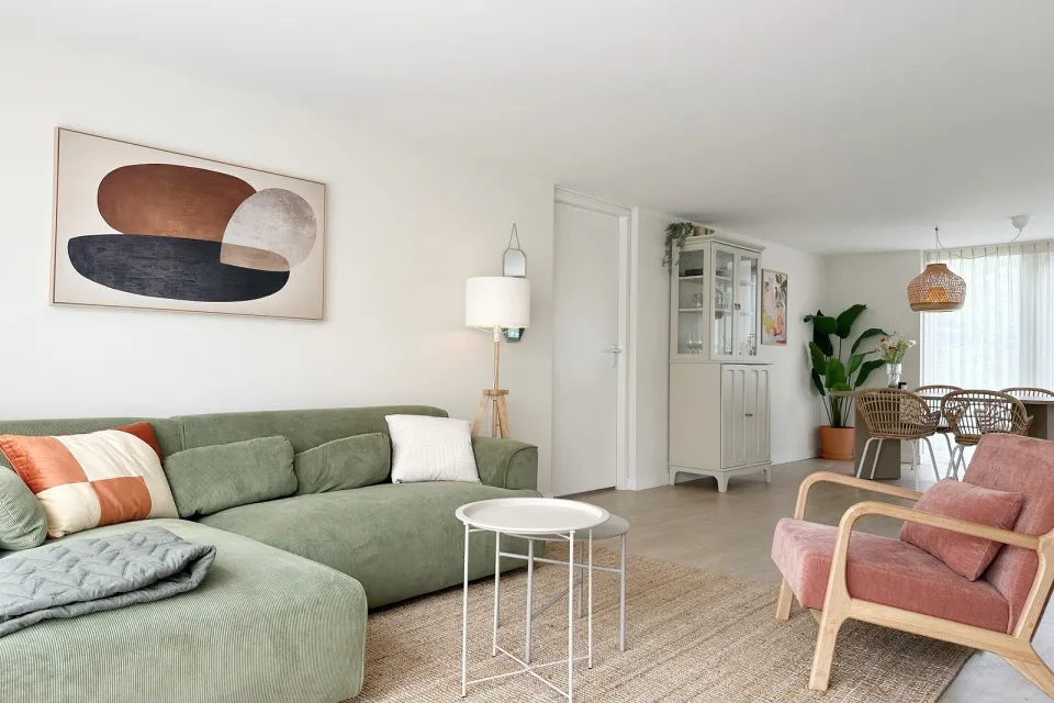 Stap binnen in de lichte woonkamer. Je ziet een comfortabele zithoek, een eettafel en een televisie. Alles volop licht. De open keuken sluit er direct op aan. Daar vind je een oven (hetelucht), magnetron, vaatwasser, koelkast met vriesvak, elektrische 4-pits kookplaat, afzuigkap, broodrooster, filterkoffieapparaat en waterkoker.
